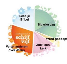 Je bent nu een nieuw leven begonnen. Maar hoe ga je verder? Wat betekent het om als christen te leven? Net zoals een pasgeboren babyvoeding nodig heeft om te groeien, heb jij ook geestelijk voedsel nodig. Daarom geven we je hier vijf belangrijke stappen die je helpen om te groeien in je relatie met God. We noemen dit ook wel: de Schijf van Vijf.